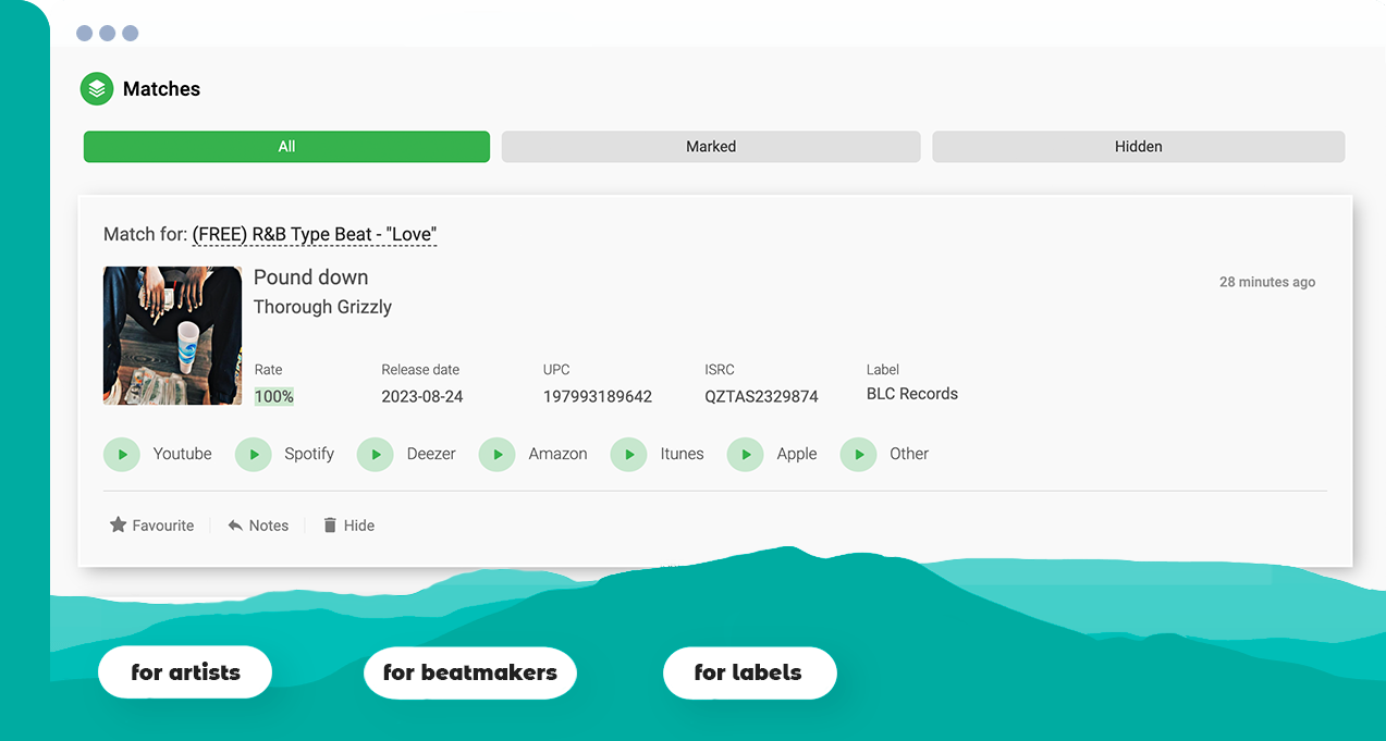 We detect not only complete matches of tracks, but also the use of excerpts. You can search for copies of both instrumentals (beats) and full compositions in order to find pirated versions, remixes and covers. The service may also be useful for sample authors.